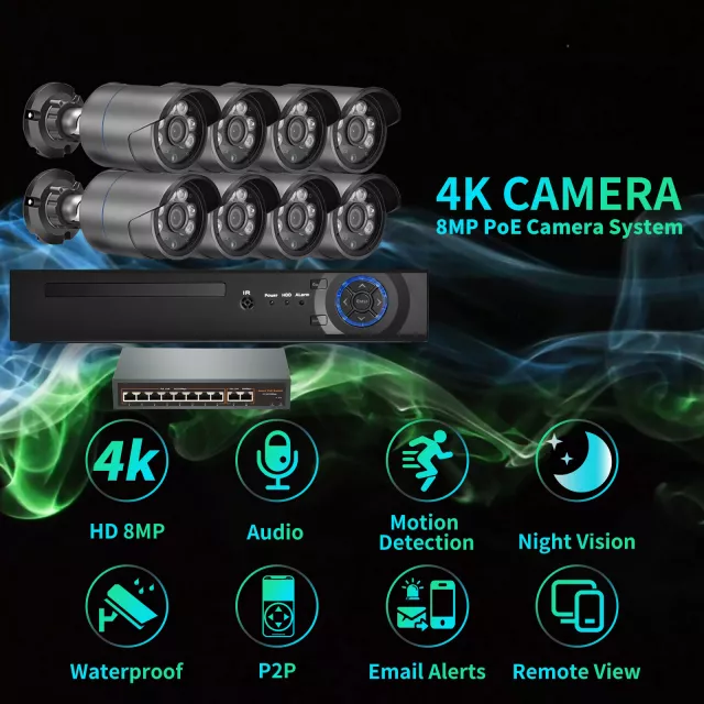Ensure the safety of your property with this advanced 4K POE Security Camera System. Offering crystal-clear 8MP Ultra HD resolution, this surveillance set delivers top-notch video clarity, making it ideal for monitoring both residential and commercial spaces. The system comes with high-performance IP cameras equipped with human detection, powerful night vision, and a weatherproof design, allowing you to keep an eye on every corner of your property, day or night. With plug-and-play simplicity and remote access through your smartphone, securing your home or business has never been easier.