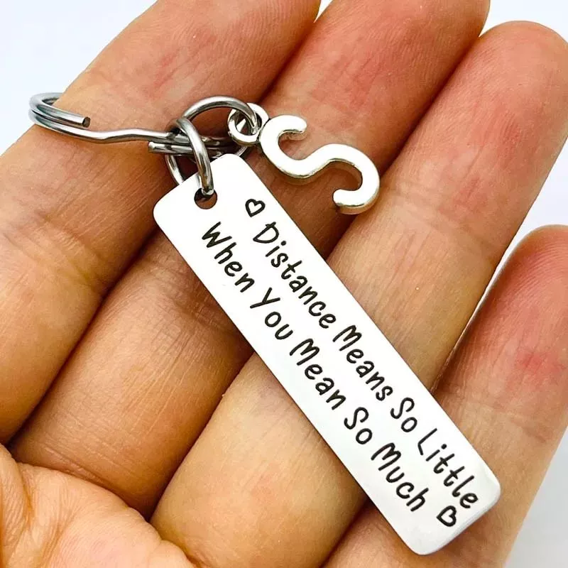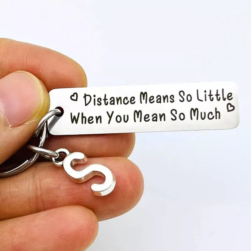 Made from high-quality stainless steel, this keychain promises durability and a timeless elegance. Its sleek silver color and neat finish make it an accessory that complements every style. The heartwarming phrase “Distance means so little when you mean so much” is expertly carved on the keychain, symbolizing the strength and resilience of your relationship.
