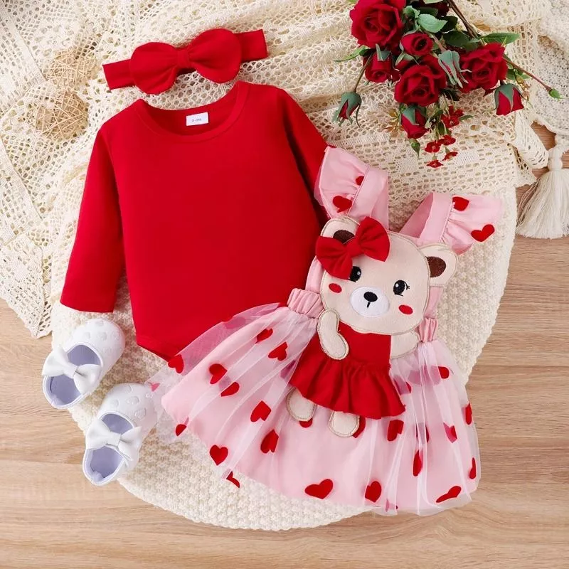 Introducing our adorable Newborn Infant Baby Girl Clothes Set, a perfect blend of style, comfort, and cuteness for your little one. This charming set includes a long sleeve red romper, a heart print suspender skirt with a plush teddy bear detail, and a matching headband, making it an ideal outfit for celebrating Valentine’s Day and creating unforgettable memories.
